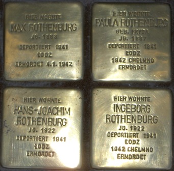 Max Rothenburg und Paula Fryda heirateten am 7. Juni 1921, vermutlich in Wattenscheid. Paula war 34 Jahre alt. Ihre Mutter war 1916 gestorben, vielleicht führte sie nach deren Tod den Haushalt. 1922 wurden die Zwillinge Hans-Joachim und Ingeborg geboren. Familie Rothenburg lebte bis 1938 am Kaiser-Friedrich-Ufer 9. Der große Wohnblock zwischen Kaiser-Friedrich-Ufer, Heymannstraße und Hohe Weide wurde zwischen 1921 und 1925 von der Baugenossenschaft innerhalb des Mietervereins von 1890 (heute KAIFU-NORDLAND e. G.) gebaut, und Rothenburgs gehörten zu den ersten Mietern. Erst nach 1938 zogen sie in die Blücherstraße 38, die heutige Kottwitzstraße. Von beiden Kindern ließen sich in den Akten keine Spuren finden. Sie müssten um 1929 eingeschult worden sein. Auch von den Eltern wissen wir nicht, wie sie in der NS-Zeit lebten. Man kann davon ausgehen, dass Max Rothenburgs wirtschaftliche Existenz nach 1933 zerstört wurde und er als Handelsvertreter keine Aufträge mehr bekam. Sein Antrag, bis zum 30. Juni 1939 als Handelsvertreter tätig zu sein, war noch genehmigt worden. Ab Januar 1940 unterlag er einer "Sicherungsanordnung".